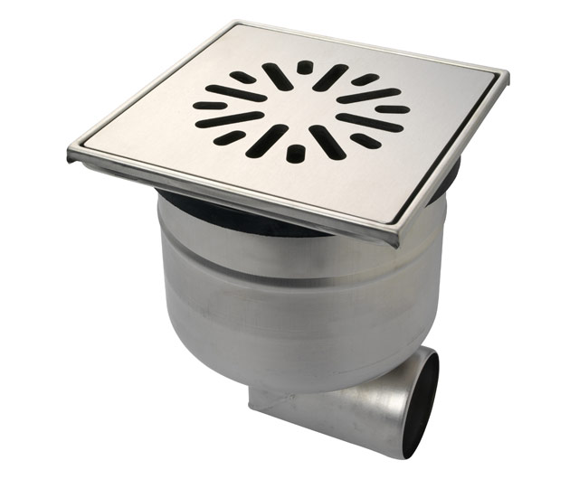 Aquaberg RVS316 vloerput 200x200 mm zijaansluiting diameter 75 mm RVS316 rand/rooster belasting max. 30 kN in hoogte verstelbaar