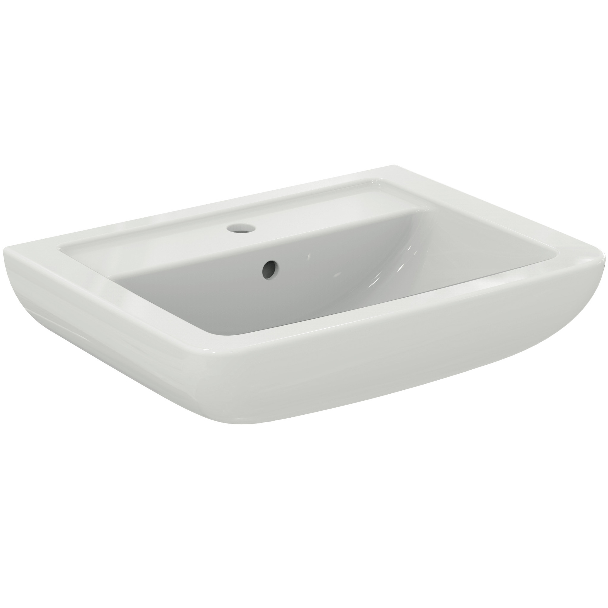 Eurovit Plus wastafel 600 mm van keramiek met waterlijst. 1 kraangat midden doorgestoken, 2 kraangaten links en rechts voorgestoken. Met overloop. Bevestiging met 2 schroeven M10 x 140 mm. Exclusief bevestigingsmateriaal. Glanzend wit.