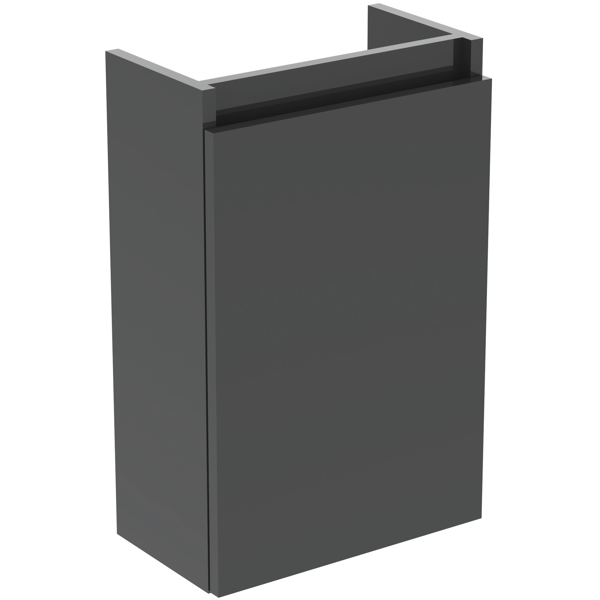 Tiempo fonteinmeubel 354 x 202 x 550 mm. Wandmontage. Inclusief bevestigingsset. 1 deur pull-to-open met softclose. Deur links of rechts omkeerbaar. 1 glazen legplank. Te combineren met fontein Tempo E2112 / E2113. Grijs.
